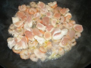 Mettete il una padella capiente (meglio ancora in un wok) pollo e gamberetti con un goccio di olio e fate cuocere per cinque/sette minuti.