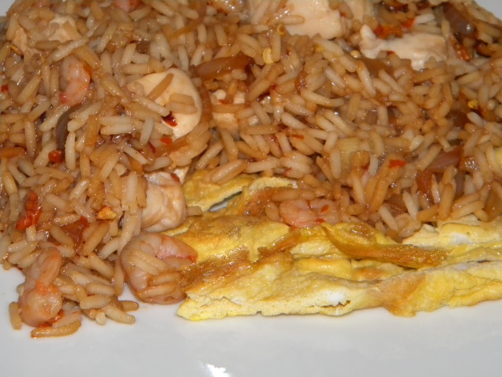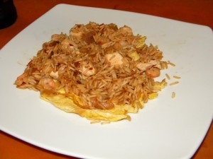 Spento il fuoco toglieteli dal wok nel quale verserete la cipolla e lo scalogno tritati finemente, con un cucchiao di olio. Fate imbiondire per un paio di minuti, dopo di che aggiungerete il riso. Una volta tostato versate due cucchiai di salsa di soia, il pollo, i gamberetti e mescolate con cura. Lasciate su fiamma vivace per qualche minuto.