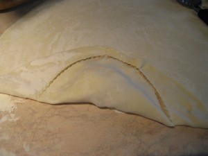 Stendere quindi la pastasfoglia su un fondo di farina (per evitare che si attacchi al piano di lavoro) ed eventualmente tirarla col matterello se è un pò troppo spessa.