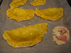 Sbattere i tuorli d’uovo con un pizzico di sale: se il risultato vi sembra troppo denso, potete aggiungere un pò di acqua. Spennellare le mezzelune con i tuorli sbattuti.