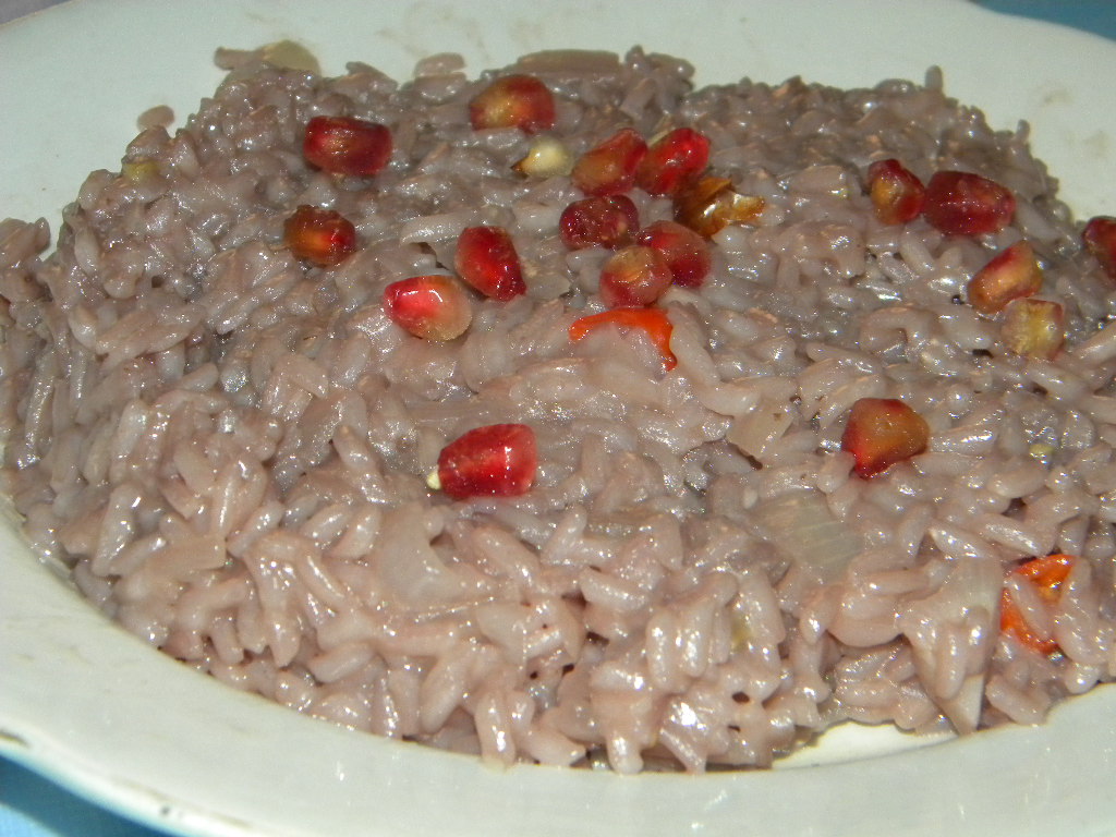 Quando sarà evaporato versate un mestolo di bordo e lasciatelo consumare; quando anche il secondo mestolo si sarà asciugato incorporate il succo di melograno e lasciate terminare la cottura del riso. Se necessario utilizzate dell’altro brodo.